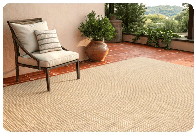 Beyond sizing, fiber choice matters enormously outdoors. The right material needs to handle moisture, resist UV fading, clean up easily, and hold its appearance through seasons of use. For covered sunrooms or screened porches that sit somewhere between indoors and out, natural fibers like sisal can be a beautiful option, offering the texture and warmth of an indoor rug with enough durability for a transitional space. You can explore more about fiber options on our custom rug page.