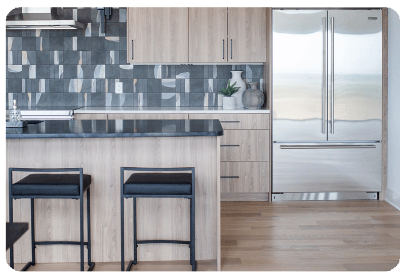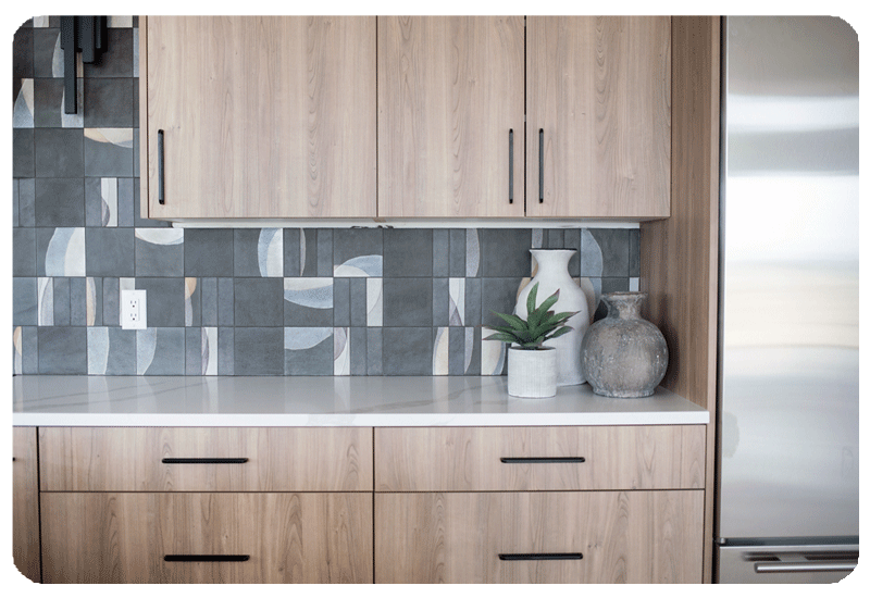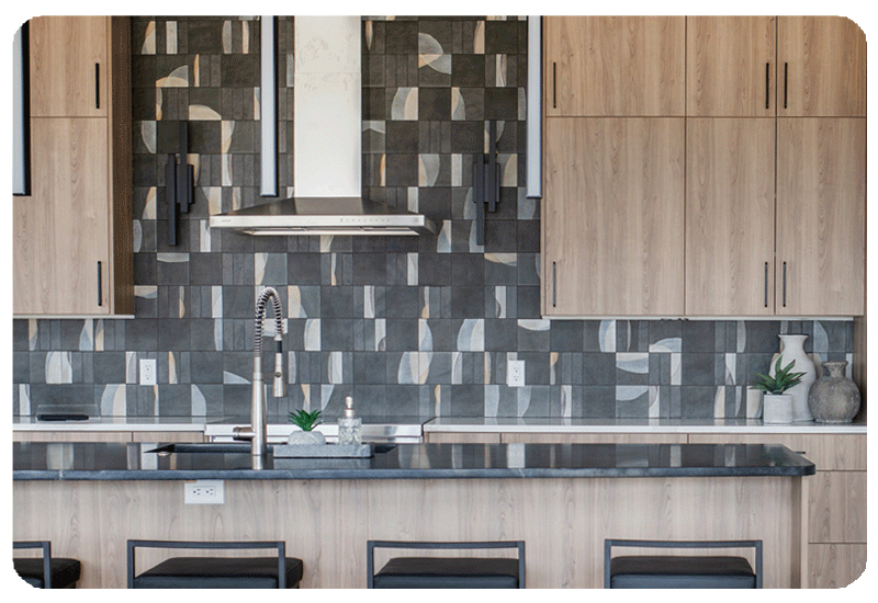 Homeowners are moving away from subway tiles and opting for the unique. These organic modern style tiles with a handmade style and texture meet that demand. The graphite color tile in this tile has a neutral color design with varying patterns in curves, with horizontal and vertical shapes. There’s versatility in choosing the installation pattern all you have to do is unleash your imagination with expert guidance from a FLOOR360 interior designer.