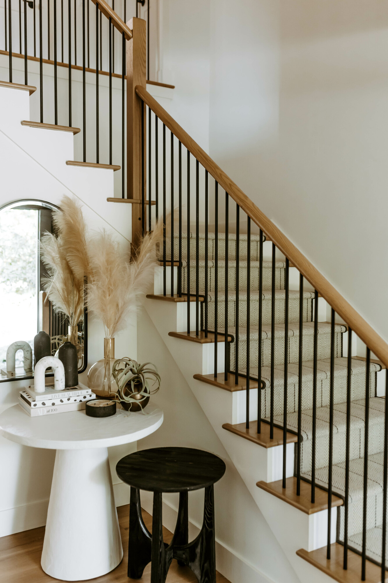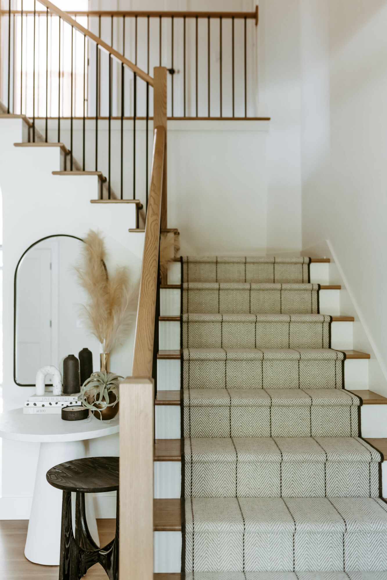When Ashley was making the carpet selection in the FLOOR360 showroom for her custom carpet stair runner, she considered a number of linear patterns like plaid and herringbone while sticking to a neutral color palette. The carpet material she chose was 100% wool because it’s an organic and sustainable material that will resist wear and stains with the added benefit of being hypoallergenic.